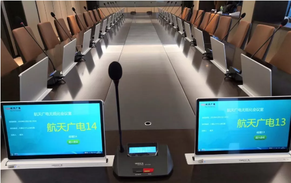 航天广电无纸化会议系统服务于合肥某会议室!提供强大的会议应用功能,实现办公自动化,提高开会效率,安全低碳环保!航天广电无纸化会议系统会议,支持信息上传、文件分发、阅读查看、文件批注、会议签到、投票表决、电子白板、文件交互传送、视频交互传送、会议交流、信息通知、会议服务、信息记录等功能,满足会议的各项需求!会议扩声智能中控