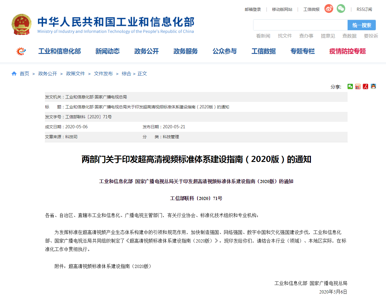 近日,工信部和国家广播电视总局发布关于印发超高清视频标准体系建设指南(2020版)的通知,到2020年,初步形成超高清视频标准体系,制定急需标准20项以上,重点研制基础通用、内容制播、终端呈现、行业应用等关键技术标准及测试标准。到2022年,进一步完善超高清视频标准体系,制定标准50项以上,重点推进广播电视、文教娱乐、安防监控、医疗健康、智能交通、工业制造等重点领域行业应用的标准化工作。